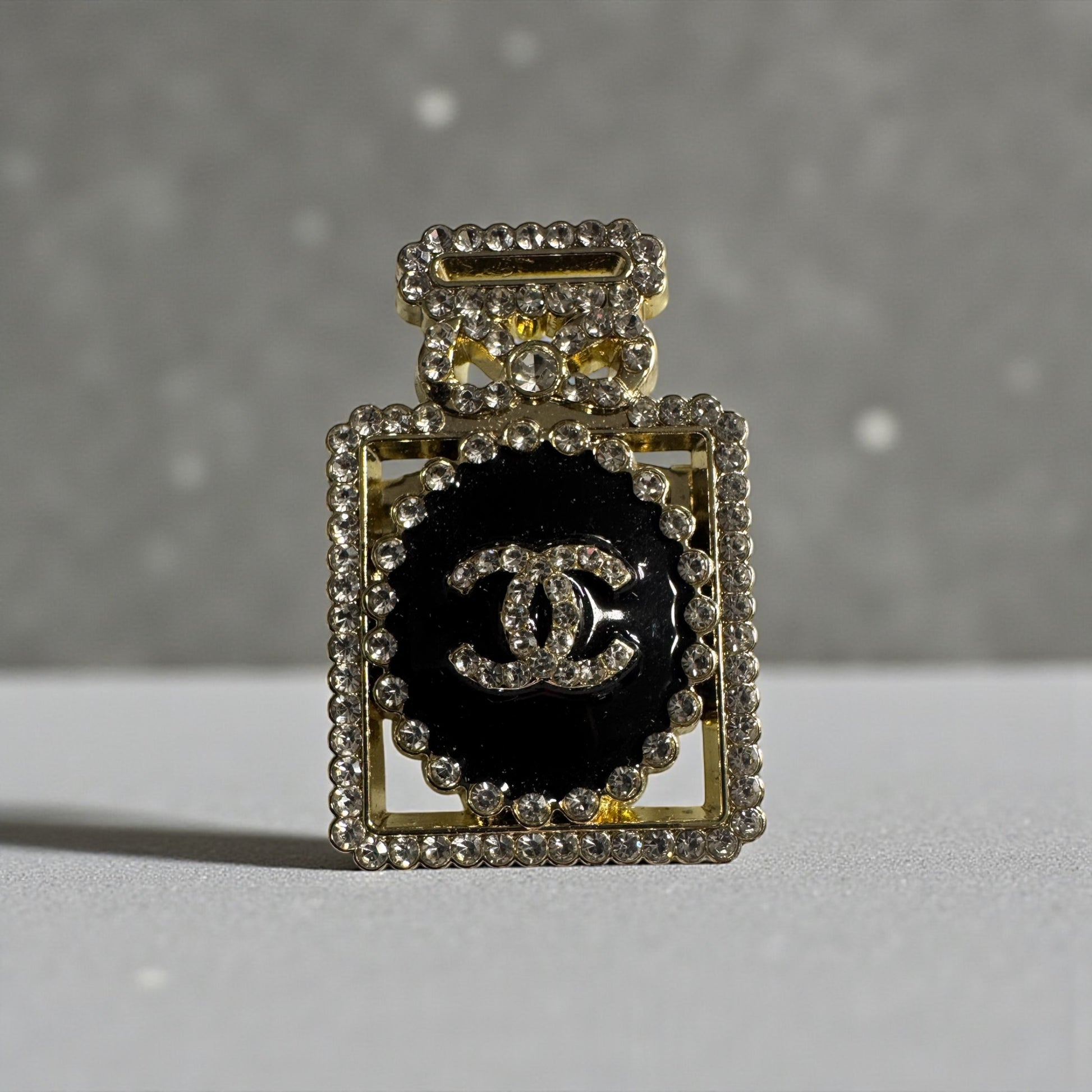 Black & Gold Perfume Bottle Brooch – Rhinestone Double-C Designer-Inspired Pin
