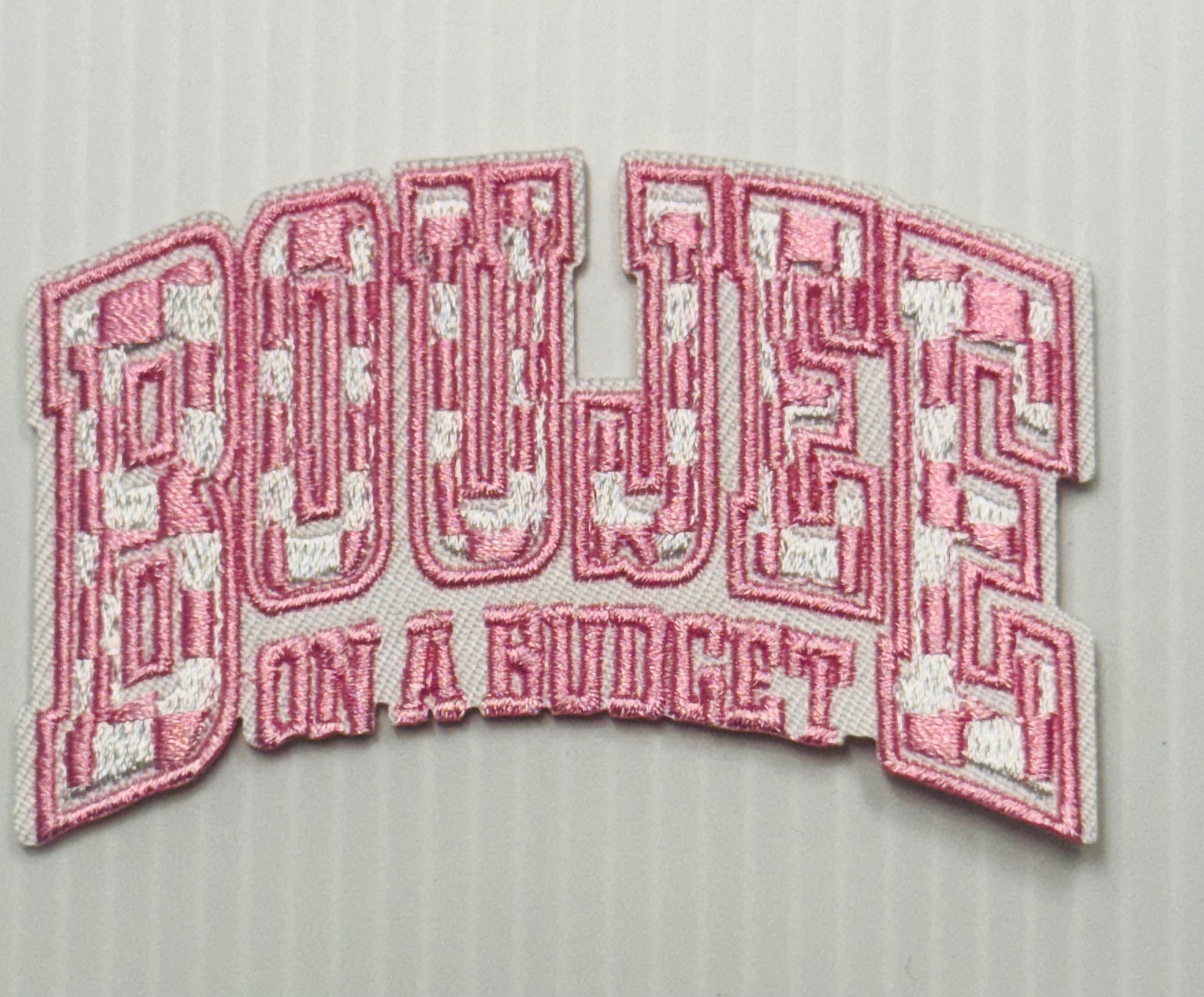 A cute pink-and-white check embroidered patch with varsity lettering. Perfect for girly-but-glam looks.
