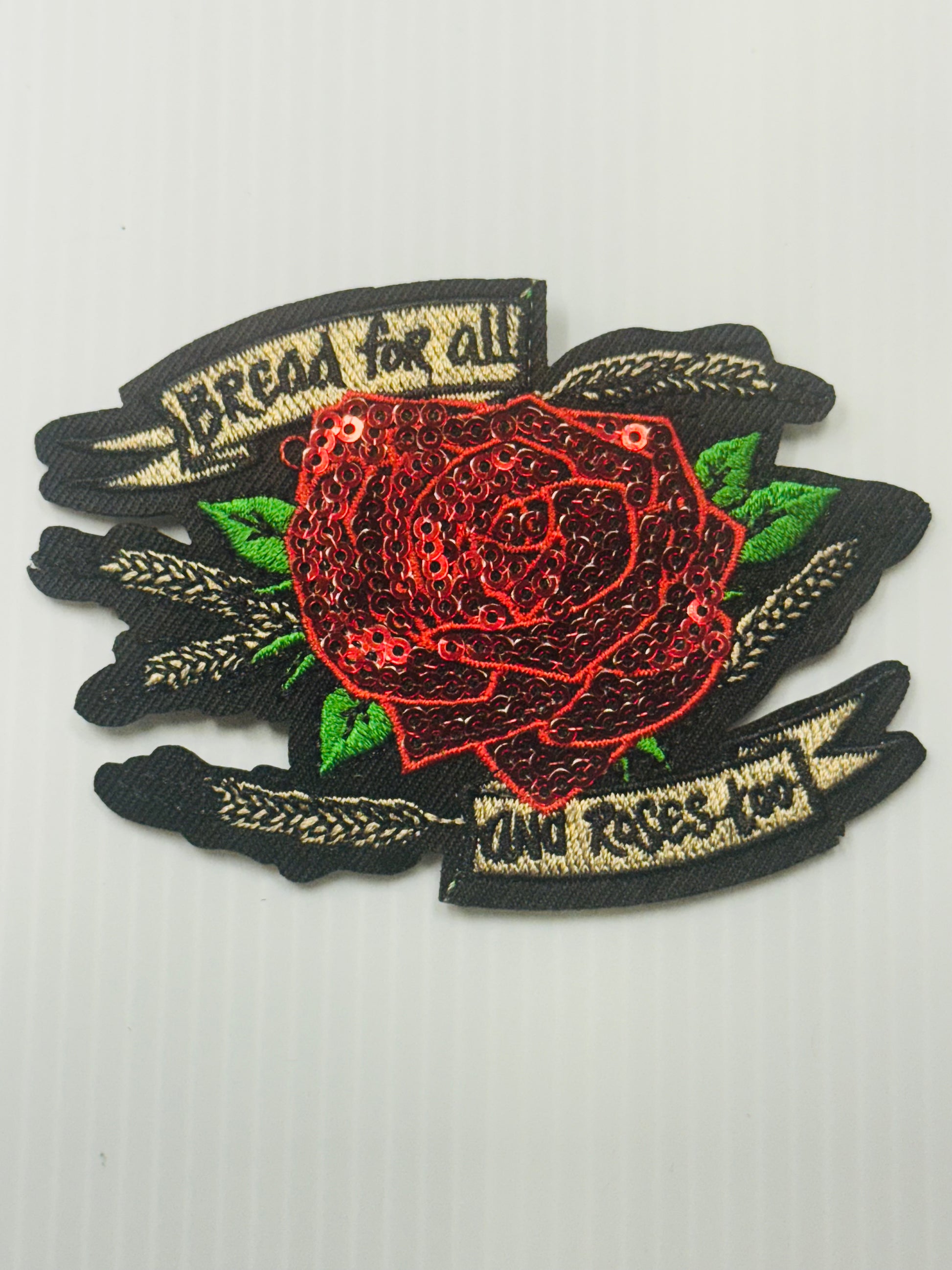 A striking patch featuring a sparkling red sequin rose with embroidered leaves and banner text — perfect for expressive or political fashion statements.