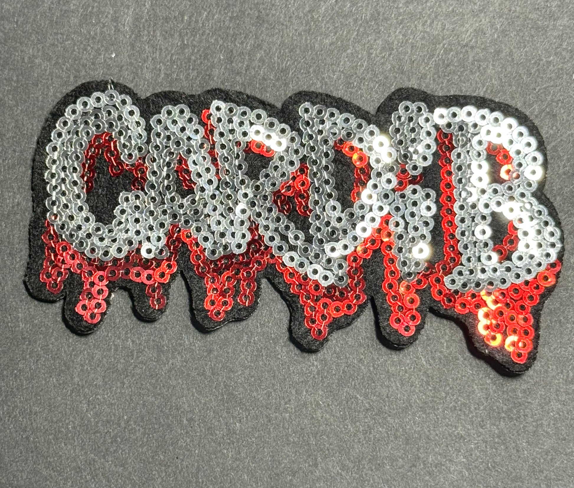 Eye-catching silver and red sequin “Cardi B” patch with a dripping design. Ideal for jackets, hoodies, jean vests, and bold fashion DIYs.