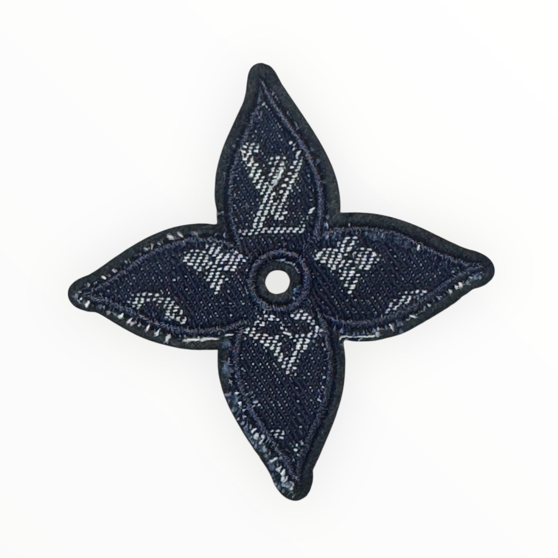 A bold embroidered denim floral patch with a four-petal design and textured stitching. Ideal for jackets, bags, hats, and custom apparel.