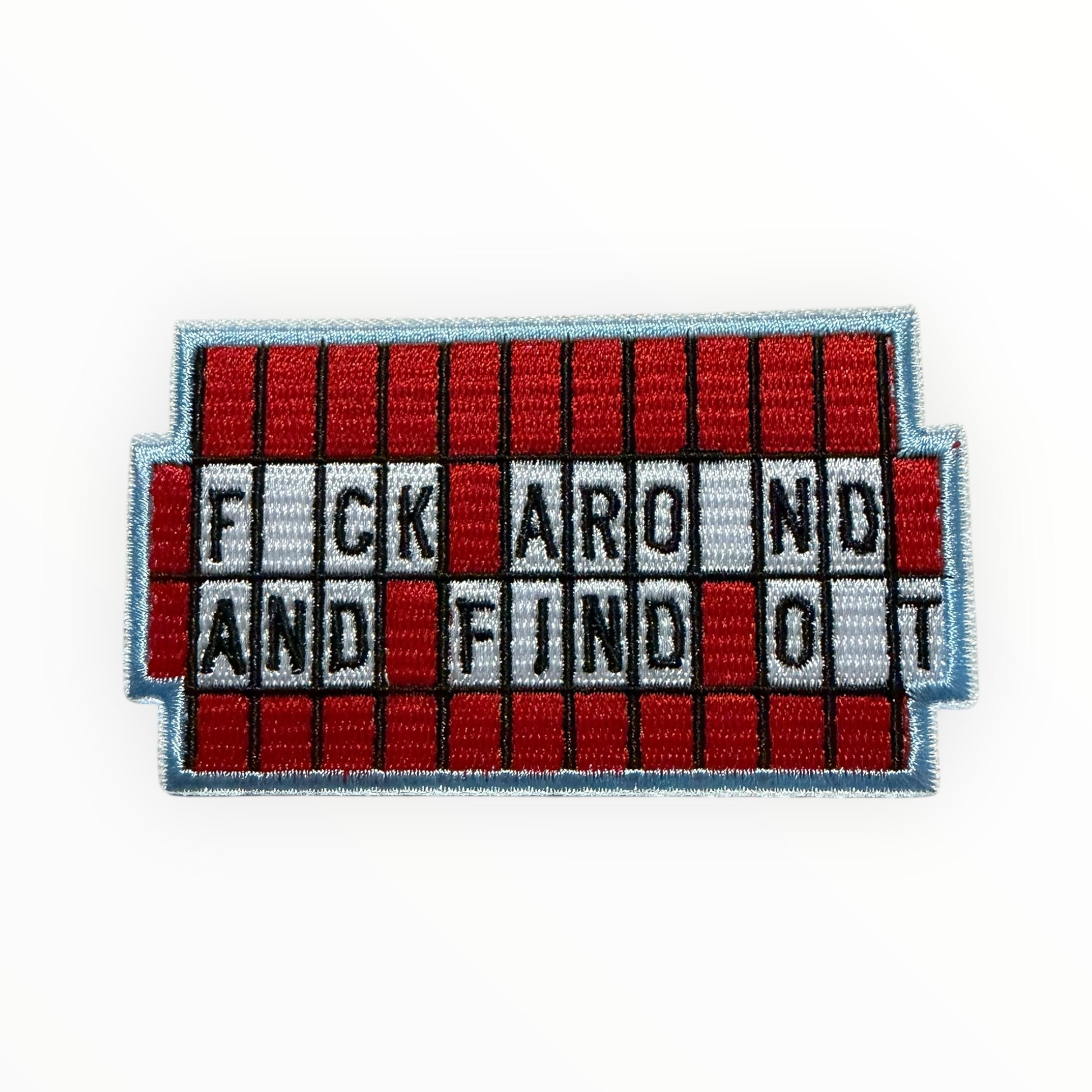 Rectangular novelty patch designed like letter tiles spelling “Fck around and find out.” Bold red, white, and black embroidery with grid detail.