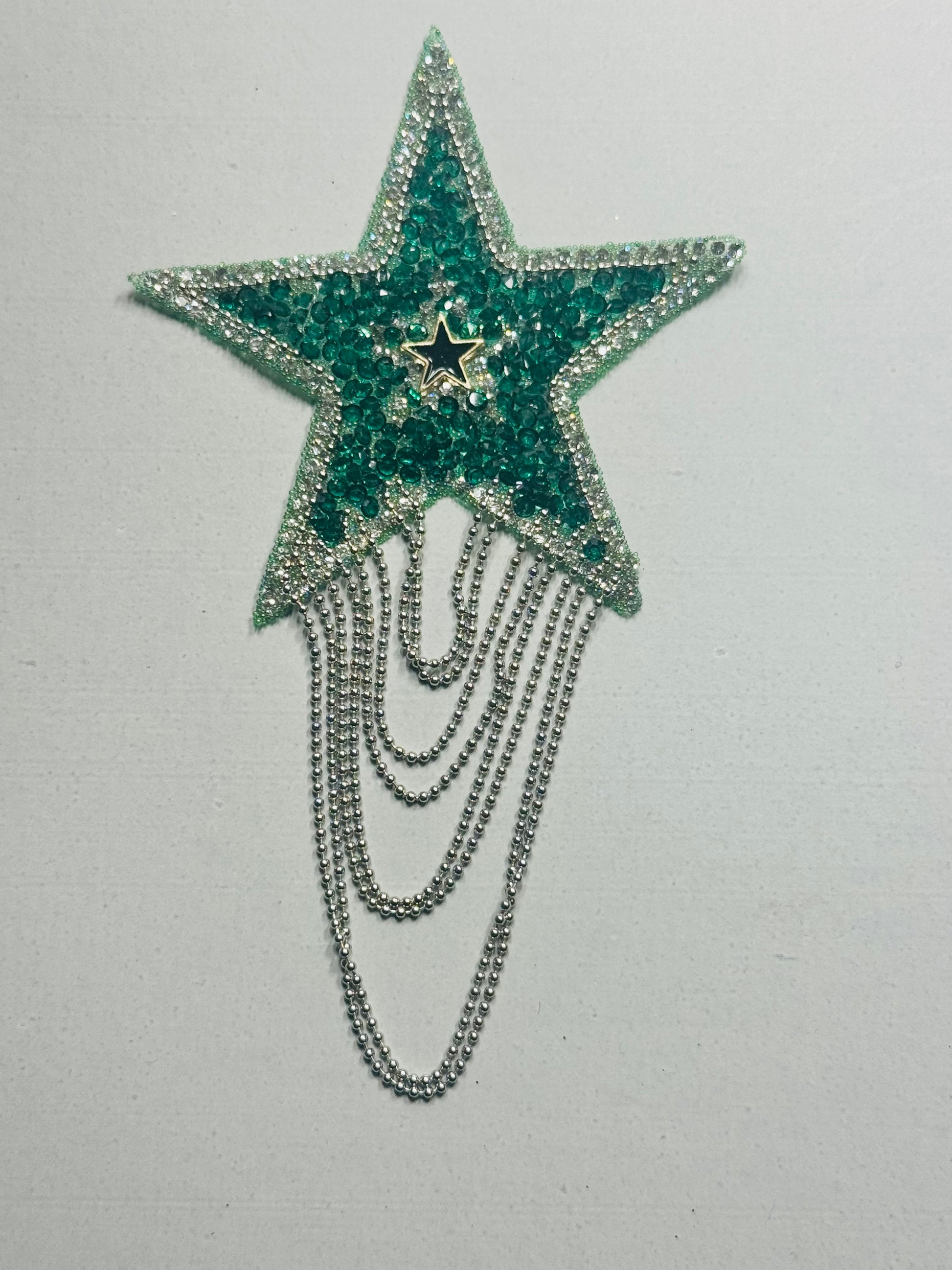 Green Star Silver Chain Elevate your jewelry collection with this striking green star pendant suspended from a refined silver chain. The vibrant green stone catches light beautifully, creating an eye-catching focal point that transitions seamlessly from casual to formal occasions. Crafted with quality silver-tone metal, the delicate chain provides elegant support while maintaining durability for everyday wear. Perfect for layering or wearing solo, this piece combines contemporary design with timeless appeal. An ideal gift for those who appreciate distinctive, meaningful accessories.