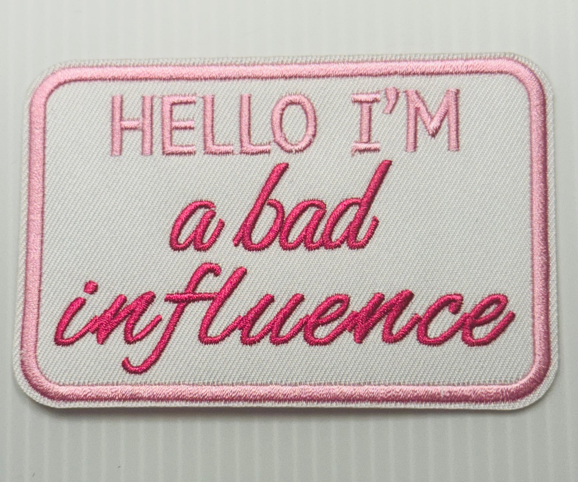 Make a bold statement with this edgy patch featuring the phrase "HELLO I'M A BAD INFLUENCE." Perfect for customizing jackets, backpacks, or apparel, this eye-catching design adds personality and attitude to any surface. Whether you're a seasoned collector or looking to personalize your gear, this patch delivers instant character. High-quality construction ensures durability through repeated wear and washing. An ideal choice for those who embrace their rebellious side and aren't afraid to show it.