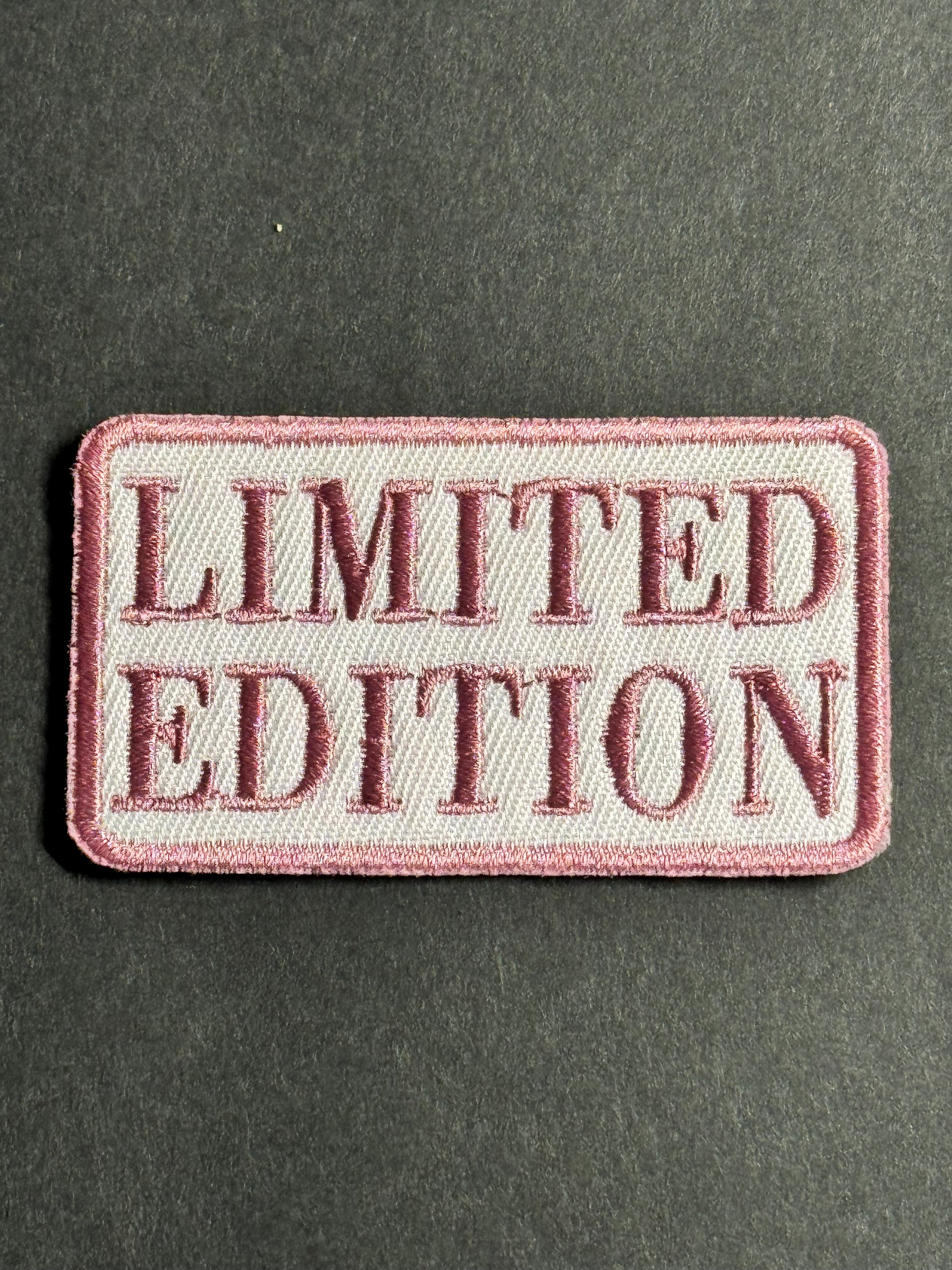 A chic pink-and-white Limited Edition embroidered patch perfect for jackets, jeans, tote bags, or custom apparel. Clean, bold, and ready to add personality to your fits.
