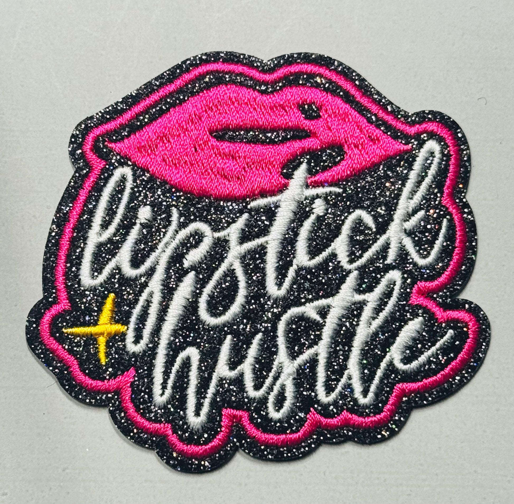 A glamorous embroidered patch featuring glitter-filled script reading “lipstick + hustle” with vibrant pink lips. Perfect for beauty lovers, stylists, and anyone who enjoys a little sparkle.