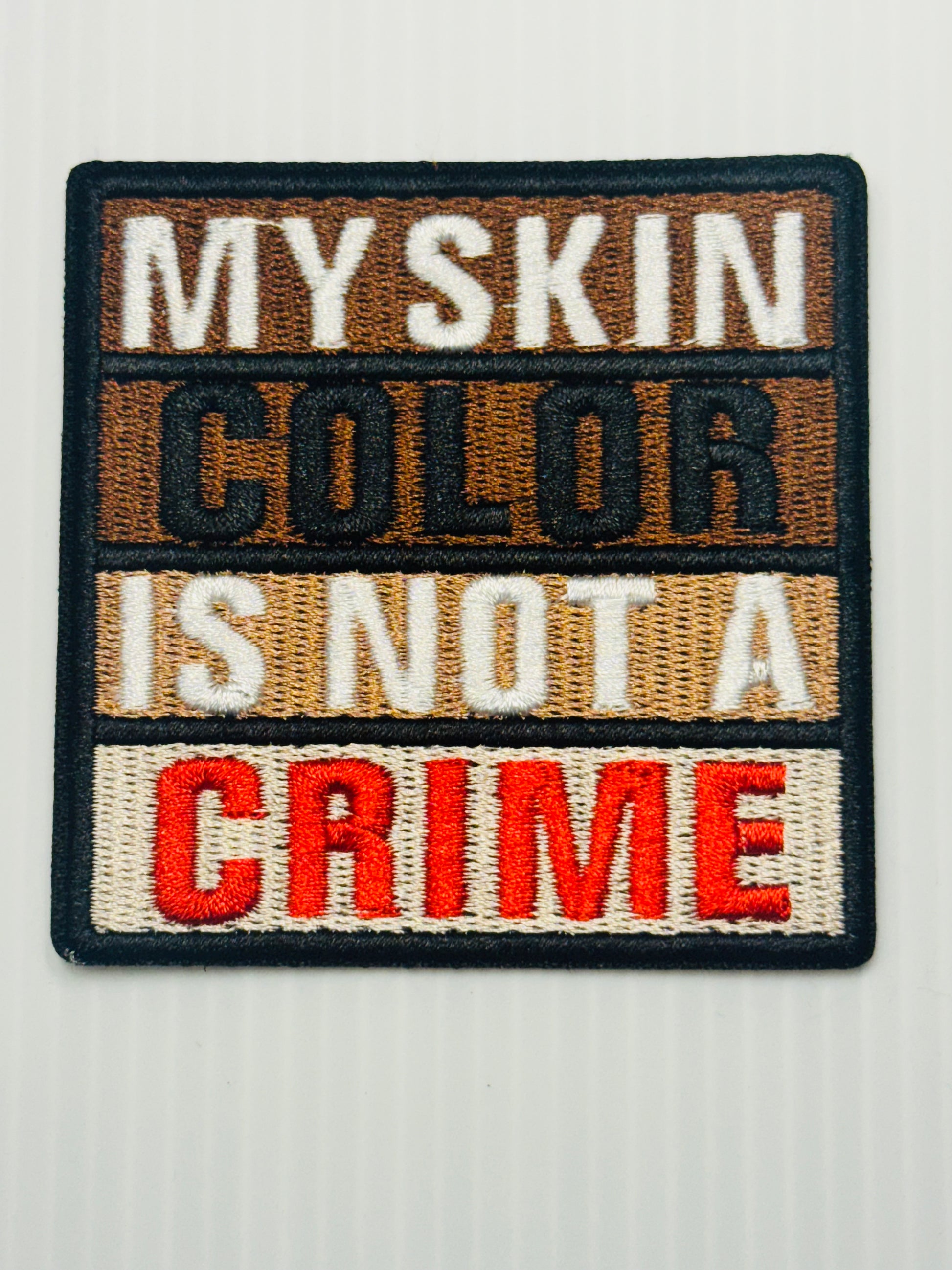 Square embroidered patch with striking red lettering and multi-tone browns, promoting justice and awareness.
