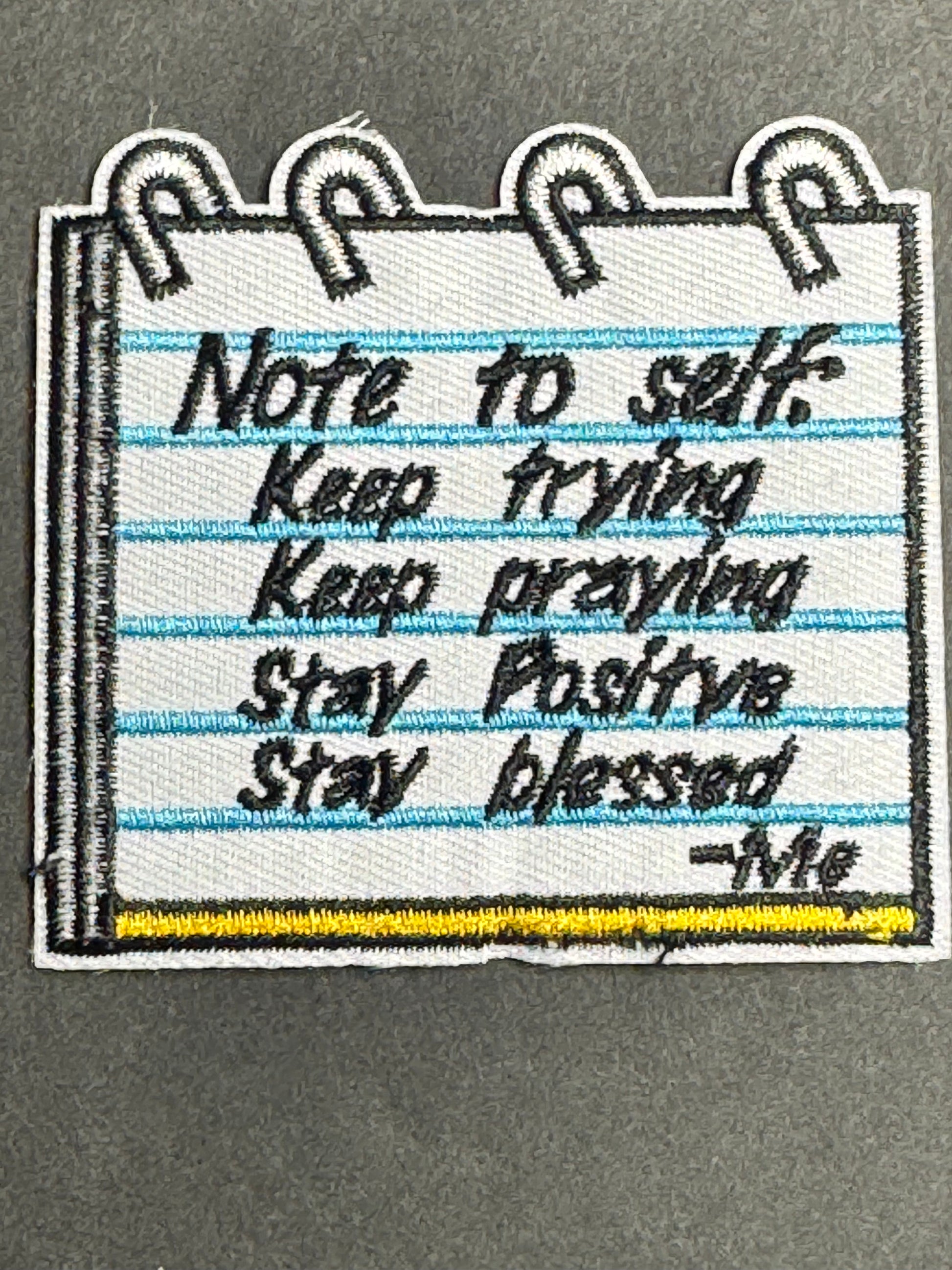 Notebook-style embroidered patch with inspirational handwritten message—great for backpacks, planners, jackets, and student gifts.