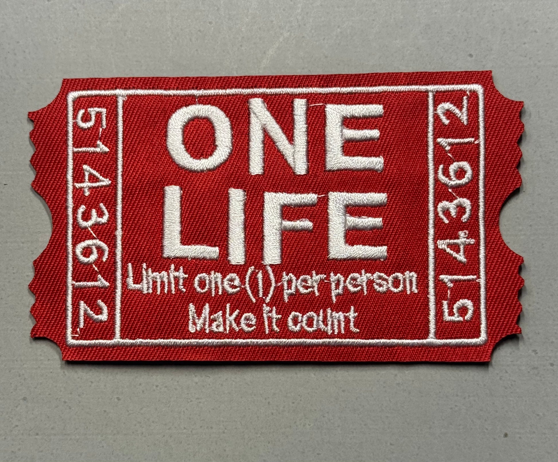 A red retro-ticket embroidered patch reminding you to live boldly. Great for travel bags, denim jackets, and everyday accessories.