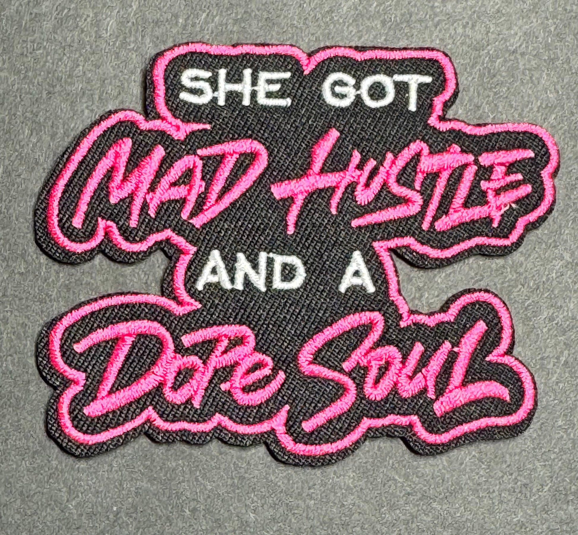Bright pink embroidered patch celebrating confidence and hustle. Perfect for personalizing denim jackets, backpacks, hoodies, and more.