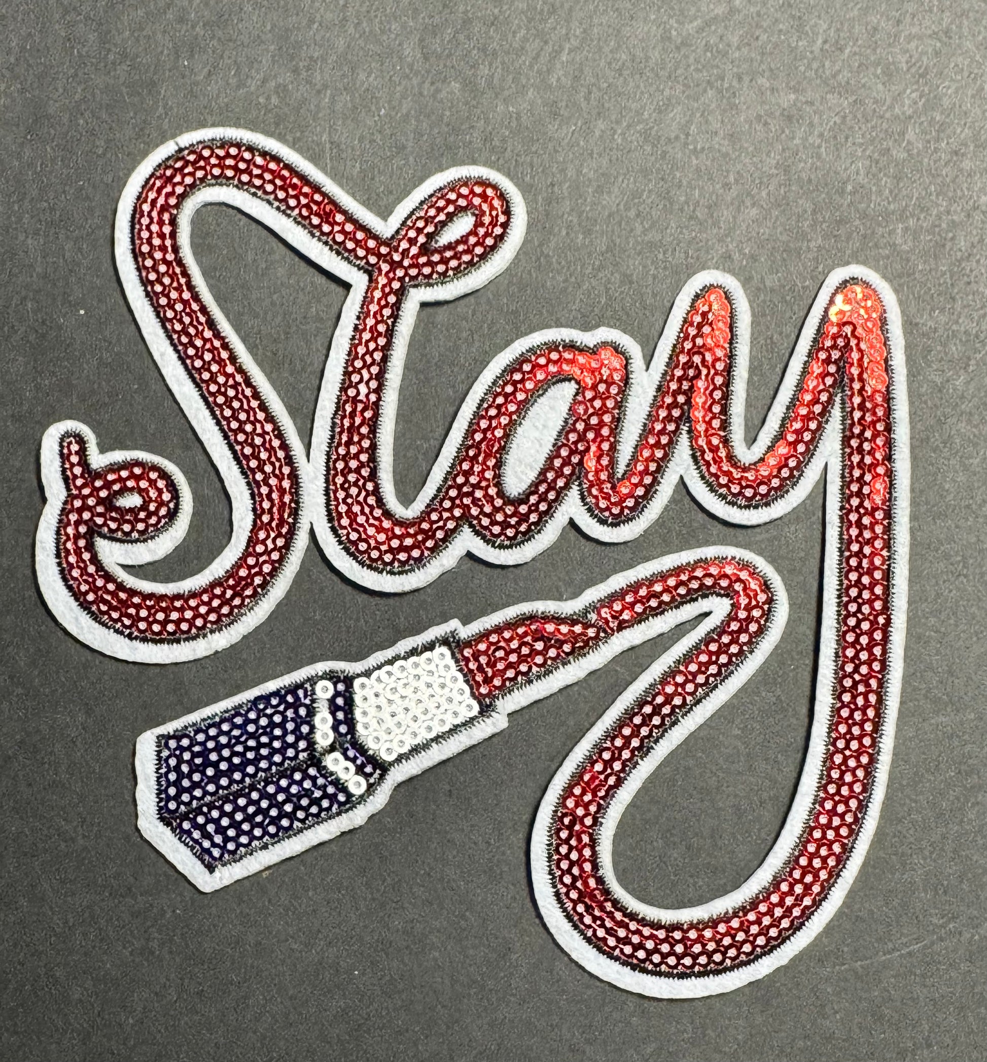 A sparkling rhinestone patch spelling “Slay,” with a lipstick graphic trailing into the lettering—perfect for glam jackets, dancewear, totes, and statement fashion pieces.