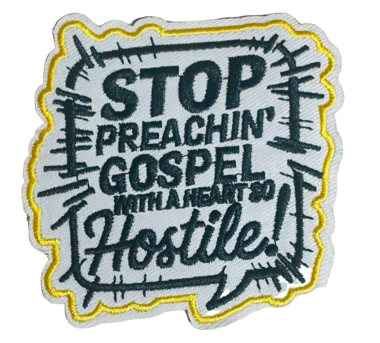 Make a statement with grace and style using the Stop Preachin’ Gospel with a Heart So Hostile Patch. This bold embroidered design delivers a meaningful message — reminding us that love should lead every conversation. With its sharp black text, bright gold outline, and edgy stitched border, it’s the perfect mix of conviction and creativity.