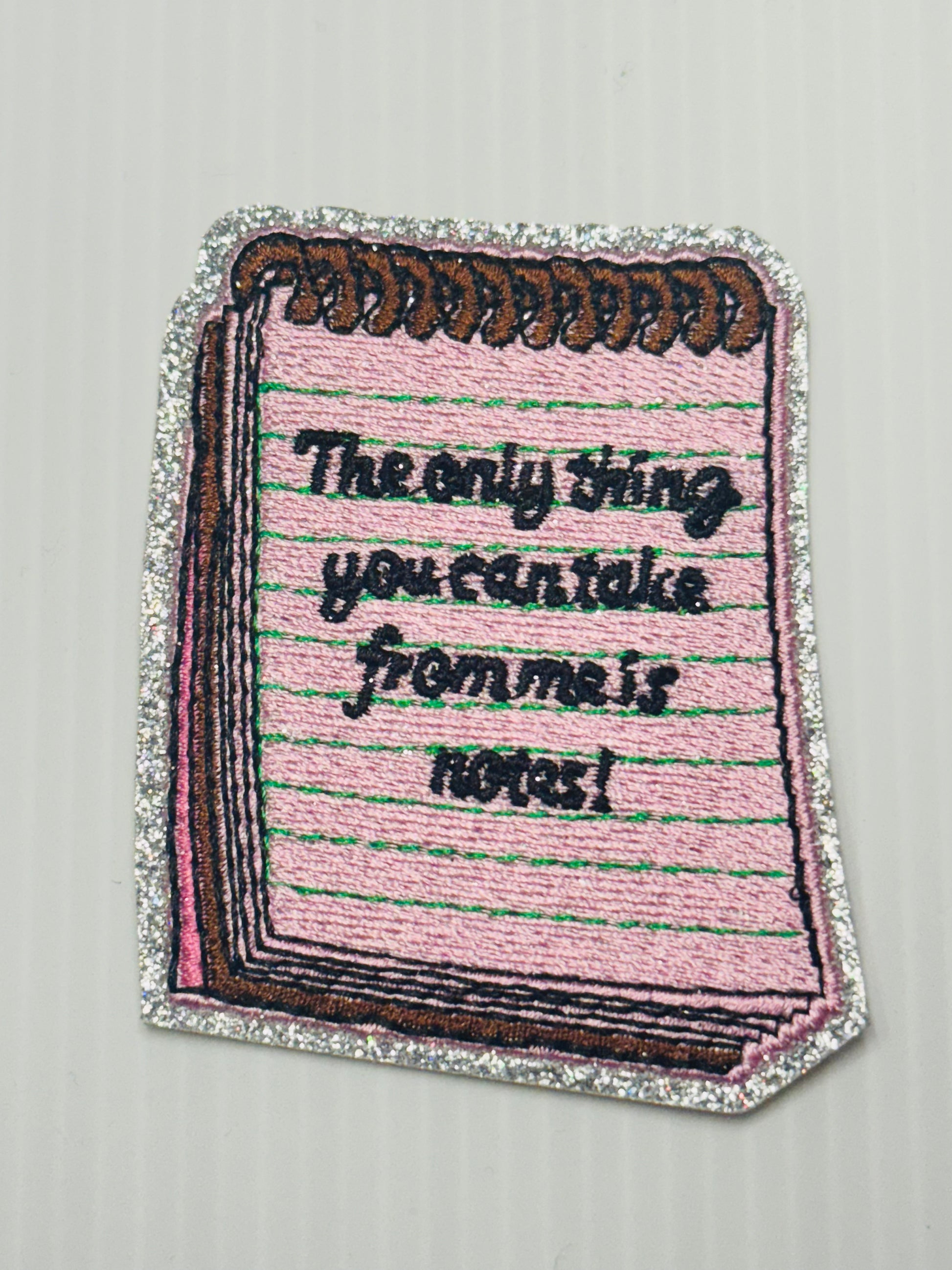 A glitter-trimmed notepad patch with a fun, sassy message—perfect for students, teachers, and stationery lovers.